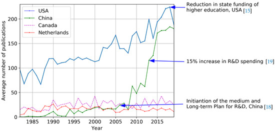 Average number of publications by academia from the top four contributing countries. Data sources: [15,18,19].