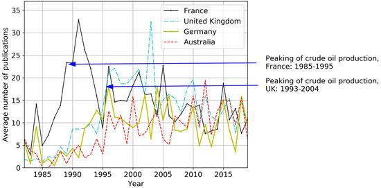 Average number of publications by France, UK, Germany, and Australia. Crude oil production data are from ref. [20].