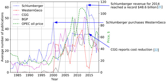 Figure 8 shows the average number of papers by oilfield service companies. The most frequent guests at the SEG annual conferences have been Schlumberger, WesternGeco, CGG, and BGP. Although WesternGeco is now a part of Schlumberger, we show them separately according to the affiliation. Schlumberger dominates industrial geophysics research, followed by CGG and BGP. In general, the number of publications by the major oilfield service companies grew steadily. Although oilfield service providers depended on oil prices, we surprisingly observe that after the 2014 crisis, the number of Schlumberger publications peaked for several consecutive years [21], followed by a decline in 2018. It should be noted that in 2014, Schlumberger reported an outstanding revenue of $48.6 billion. The dynamics of Schlumberger’s papers reflect the dynamics of oil prices with a delay of a few years. The number of CGG publications follows crude oil prices too, but since 2014, the number of publications from CGG has been declining. The 2015 Annual Report by CGG mentions the extremely difficult market environment [22], and the cost reduction measures: a reduction in the number of employees from 11,060 to 7353, the 55% general and administrative cost cuts, and a 64% cut of the cost of marine vessels (A comparison of the 2013 and 2015 indicators). In January 2020, CGG reported its exit from marine acquisition, and the sale of its ships and seismic equipment to Shearwater company [23]. It is, therefore, likely that we will see fewer publications from CGG in the coming years.