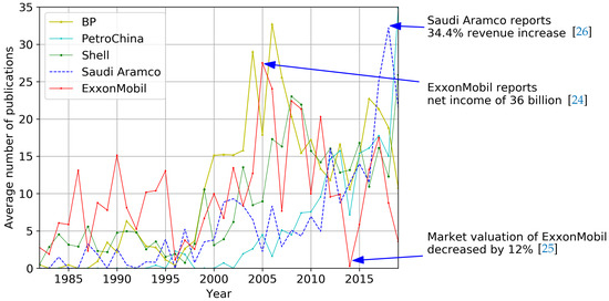 Curiously, the number of publications from academia in 2019 fell significantly. Figure 3 indicates a decrease in the number of publications from US academia in 2019 compared with 2018. Perhaps this decrease was caused by a reduction in state funding of higher educational institutions [15] (also see blue curve drop in 2018–2019 in Figure 6). However, other factors could have affected this drop. For example, during this time, major oil companies started to prepare for a “lower for a longer” scenario. They shifted focus from resource replacement to value creation, alternatively it could be a signal from the European major oil producers of an energy transition.