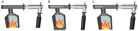 The new design of the SCC consisted of only one corona needle at the end point of a ceramic tube (Figure 1). Inside the ceramic tube was a high-voltage metallic rod with a sheath air channel surrounding the rod. The end point of this rod was sharpened to form a corona needle. The idea behind this design was to keep the corona discharge close to the preferred particle collection system (a CHX or cyclone), so that fewer particles were deposited before the desired collection stage. We estimated that only one corona needle would produce enough ions to charge the particles in the flue gas. Further, a single needle is easier to keep clean than multiple needles, and it requires a smaller amount of sheath air. In addition, this new design proved to be easier to maintain because the gap between the corona needle and ceramic shell was larger, in order to prevent electric breakdowns through the contaminated surface of the ceramic tube. Based on this new design, we developed two versions, each with a different-length ceramic tube and metal rod. The short version was primarily used in the experiments at flue gas temperature ranges of 300–400 and 400–500 °C (Figure 2A). The lower temperature range was achieved by removing the thermal insulation from around the SCC chamber for placement A. When the desired corona needle placement was deep inside the horizontal duct of the combustion reactor to achieve higher temperatures, the long version of the SCC became necessary. The long version was installed from the other end of the of the combustion reactor by inserting it half-way (Figure 2C), so as to have the corona needle on top of the flames. By inserting the long version by its full length (Figure 2B), the temperature around the corona needle was approximately half-way between placements A and C.