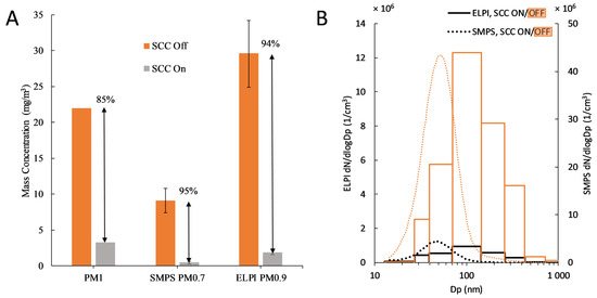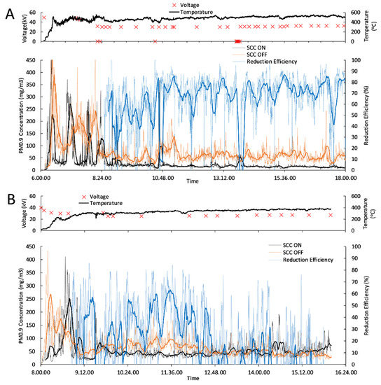 Shielded corona charger (SCC)-induced reduction efficiency in long-term experiment at temperature ranges of (A) 400–500 °C and (B) 300–400 °C for particulate matter PM0.9 measured by electrical low-pressure impactor (ELPI).
