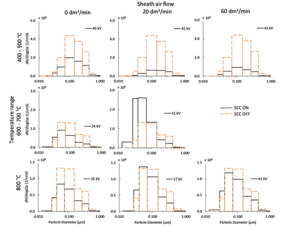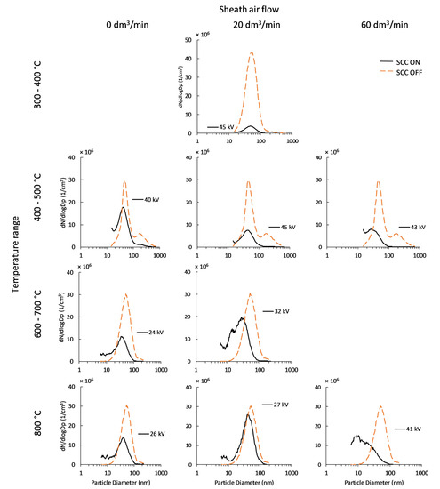 The surrounding temperature had a certain effect on the SCC’s maximum stable voltage, as summarized in Table 2. In the 400–500 °C temperature regime, maximum voltages of 40 kV and 45 kV were reached with sheath air off and on, respectively. However, without sheath air, the corona became unstable in a matter of minutes and the HVPS started adjusting the voltage, which resulted in a lower reduction efficiency (50% of PM0.9 mass). A sheath air flow of 20 dm3/min was sufficient to keep the corona stable, maintaining a reduction efficiency of 76%. Note that a sheath air flow of 60 dm3/min had no noticeable effect on the results. In the 600–700 °C temperature regime, the corona discharge was unstable over voltages of 24 kV and 32 kV with sheath air off and on, respectively. The corresponding PM0.9 reduction efficiencies were 57% and 41%, respectively. Here, the particle number concentration doubled (negative reduction efficiency) when the sheath air was on. Similar results were obtained at the highest temperature of 800 °C, wherein a relatively low stable corona voltage was recorded, with both no and 20 dm3/min sheath air. Nevertheless, the PM0.9 reduction efficiency at this high temperature was approximately 50%. However, a much lower or even negative reduction efficiency was measured for particle number concentration PN0.9. The negative reduction efficiency was caused by new particle formation, as is explained later in this section when we discuss the particle size distributions. A high sheath air flow of 60 dm3/min stabilized the corona up to 41 kV, thereby achieving high reduction efficiencies of 87% and 39% for PM0.9 and PN0.9, respectively.