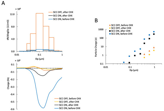 (A) Comparison of particle number and charge size distributions before and after the condensing heat exchanger (CHX) with particle charging on and off and (B) single particle charge distribution.