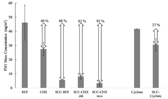The effect of the SCC upstream of the cyclone was less pronounced, removing approximately 27% of PM1 (Figure 9). This lower PM1 reduction, as compared with the SCC operation upstream of the heat exchangers, could be the result of various factors. First, the flue gas residence time in the cyclone is only 0.12 s. Second, highly turbulent flow conditions occur in the cyclone, which weakens the particle drift caused by the space charge force to the surfaces, while the flow conditions in the CHX are laminar. Despite the moderate PM reduction efficiency of the SCC–cyclone setup, the SCC could still be useful if operated upstream of the cyclones in small- to medium-sized boilers that have problems fulfilling the legislative emission limits, but do not require very high particle emission reduction improvements. When higher PM reduction efficiencies are required, either traditional particle filtration systems, such as ESPs or fabric filters, must be considered, or, if possible, the SCC system can be used upstream of the heat exchangers. However, as we previously mentioned, the SCC’s operating conditions, such as temperature, affect its efficiency, and the applicability of the SCC system in existing boiler designs is case-specific.