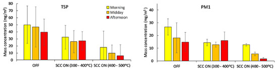 The start of this experiment was characterized by high PM emissions and fluctuating emission concentrations, which is typical for the ignition and heating phases of a combustion boiler system. During these phases, the calculated reduction efficiency fluctuates significantly. When the combustion conditions stabilized, the reduction efficiency converged to approximately 75% when operated at 400–500 °C (Figure 10A), and there were no signs of decreased filtration efficiency due to SCC fouling. At an operating temperature range of 300–400 °C (Figure 10B), the highest reduction efficiency achieved was approximately 60%. Here, the voltage had to be reduced to avoid electrical breakthrough, causing the PM reduction efficiency to decrease after reaching the maximum, apparently due to the fouling of the SCC tube. The long-term performance of the SCC was evaluated by collecting filter samples in the morning, midday, and afternoon of the measurement day (Figure 11), which correspond to ignition, intermittent, and stable combustion conditions, respectively, as the combustion reactor warms up to its stable temperature. The respective PM concentrations were the highest for the ignition phase and lowest for the stable combustion conditions. In the morning, the filter samples showed increased concentrations of particle mass, but the SCC was able to reduce it greatly. In the afternoon, the SCC in the 300–400 °C setup did not noticeably reduce the PM concentration, whereas in the 400–500 °C setup, the SCC decreased the TSP and PM1 concentrations, on average, 84% and 89%, respectively. Thus, a higher temperature range is required for the oxidation of soot deposits from the SCC tube in order to maintain the constant operation of SCC at high soot loads. At lower temperatures, the SCC requires further optimization to lower the leakage current.