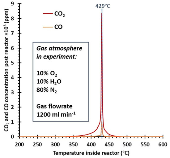 Further experiments regarding the temperature required for soot oxidation were performed separately with SCC tubes that were coated by soot in the lower temperature experiments. The results indicate that at least 430 °C is required for the oxidation of the wood combustion soot (Figure 12), which agrees well with the observed differences in soot accumulation during the long-term grate reactor experiments. To improve the soot oxidation of the SCC tubes, the tubes could be coated with a soot oxidation catalyst. For example, aluminum oxide-supported silver catalysts have displayed reasonably low temperature soot oxidation performance, and could be utilized to clean the tubes at a temperature as low as 310 °C [33,42].
