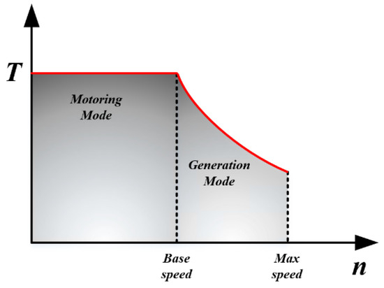 Starter–generators could provide a continuous speed range for engines from standstill to ignition speed and maximum speed, these two states being divided into the motoring mode and the generation mode, respectively. In the motoring mode, the SG could provide output to overcome resistive torque from propellers, gear boxes and accessories. After successful engine ignition, the SG generates electricity for the whole system. The torque-speed characteristics of the PMSG are shown in Figure 1.