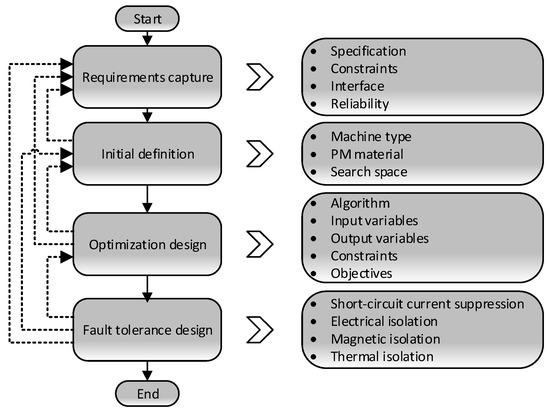 The iterative machine design processes of the main phases and corresponding tasks are shown in Figure 2; dashed lines mean the loops for potential iteration(s). The design process is derived from model-based systems engineering (MBSE), which is a system engineering methodology that focuses on creating and exploiting domain models as the primary means of information.