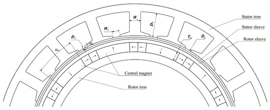 Besides some fixed parameters, a set of variables were selected that closely affect the performance of the motor, such as diameter of stator bore Db, width of tooth Wt, depth of slot Ds, opening of slot Ws, depth of tooth tip Dt, angle of tooth tip αt, thickness of magnet Tm and angle of central magnet αm, as shown in Figure 3. It is worth mentioning that the scope of the same variable in different slot/pole combinations is varied. The range of the variable should be distributed reasonably to avoid geometrical conflict.