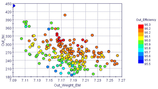 After the optimization analysis based on the joint simulation, optimization software modeFRONTIER and finite element analysis software Motor-CAD, all the feasible designs could be filtered out by constraints. The method of Pareto front is a common and intuitive approach for an optimization problem with two objectives but is inapplicable for a scenario that requires three objectives. Figure 4 shows a bubble chart that exhibits a visualization of the values of weight (kg) and the short circuit current (A) plane with the efficiency (%) values being shown as colored bubbles. All the points meet the requirements. It is difficult to choose the best design from the colorful chart.