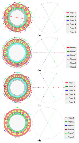 Winding arrangement and phasor diagram of dual three-phase in (a) 18 slot/12 pole, double layer (DL); (b) 36 slot/12 pole, DL; (c) 36 slot/12 pole, single layer (SL); (d) 12 slot/10 pole SL.