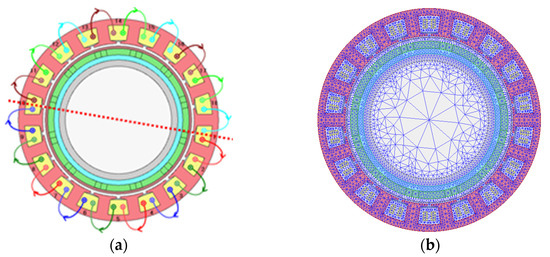 The optimal model of dual three-phase 18 slot/12 pole permanent magnet starter–generators was created using the electromagnetic simulation software ANSYS Maxwell, see Figure 6, which presents the finite element topology model and meshing plots. In this simulation, the material of PM and lamination are Recoma 33E and N10 0.1 strip, respectively. The whole machine was built to analyze the post-fault performance and to determine which three-phase may be faulty.