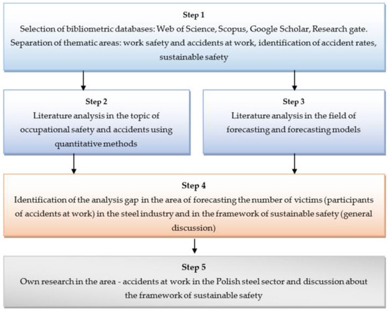 This part of paper was made on the basis of available bibliometric databases. The basic scope of the literature review concerned the issues of occupational safety and accident in industry in connection with the concept of sustainability. Searching databases for the availability of publications on accident analysis in industry or industry sectors using quantitative (econometric) methods was of particular importance. Such databases we use in the analysis: Web of Science, Scopus, Google Scholar, Research gate. This process of literature review was realized according to the steps were presented in Figure 1.