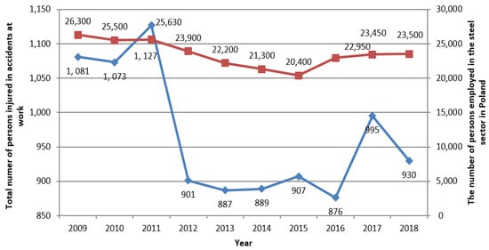 Persons injured and employed in the steel industry in Poland in 2009–2018 [66,67].