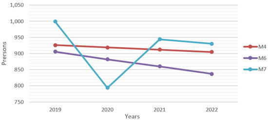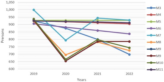 For the designated forecasts for 2019–2022, their trend was presented (Figure 4). Based on the analysis of forecast trends, it can be predicted that in 2020 there will be a decrease in the number of person injured in accidents at work in steel industry in Poland (the downward trends for this year were obtained for forecasts determined using the following models: M3, M4, M6, M7, M8, M9, M10, M11). In 2021, compared to 2020, an increase in the number of people injured in accidents at work in the analyzed sector can be expected. A slight decrease in the number of person injured in accidents during steel production in Poland can be expected in 2022.