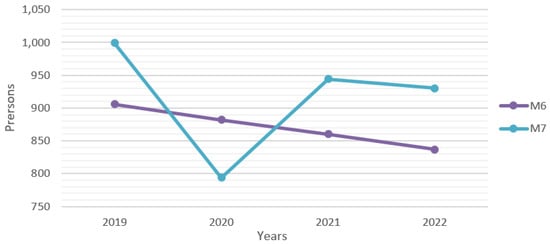 - in the case of M7, seasonal fluctuations were taken into account, hence the course of this trend (blue in Figure 5) differs from the trends of the forecasts of models 4 and 6; If only the M4 and M6 models were to be discarded and only the M4 and M6 models were analyzed, the trend of forecasting the number of people injured in accidents at work in the steel sector in Poland in 2019–2022 is decreasing, which is important information in the field of occupational health and safety issues.