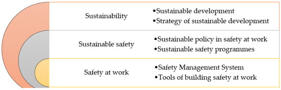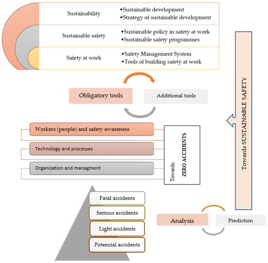The current economy is sustainable, although with different levels of advancement of solutions implemented within the framework of the idea of sustainable development. Sustainable development is most often identified with the policy of states for environmental protection. Interpretation, the sustainability has been expanded to include ever wider areas of activity of governments, enterprises, organizations etc. in pursuit of social, economic and environmental balance in the world [21]. The integrated social, economic and environmental activity of many entities has gained a new face. New arrangements, relationships and ties between various stakeholder groups are emerging in building sustainability at the level of entire economies, regions and companies. The pillars of sustainable development: the social aspect, the economic aspect, the ecological aspect from the global policy level are transferred to the pillars of an sustainable energy. The ways (paths) of transferring the assumptions of sustainability to the level of the enterprise are different and concern building various aspects of sustainability, through sustainable innovation [22,23], sustainable energy [24], sustainable consumption [25] with sustainable marketing [26] etc. Sustainability in manufacturing is a requirement as it has become apparent that production, solely focused on profits, leads to e.g., unequal distribution of resources, intensive use of resources and overexploitation of the them. Sustainability (or rather, companies striving for sustainability) can be confirmed in many areas, processes, trends, etc. [27,28]. One of the areas is sustainable safety, which aims at accident-free production through the integration of financial, material and human capital. The concept of sustainable safety (very generally speaking) is made up of the assumptions of sustainable development, with particular emphasis on building safe working conditions and work safety management (or rather, a work safety management system operating at the enterprise level). Increasing the quality of working conditions through the integration of financial, physical and human capital is the main goal of the generally understood sustainability security. The implemented sustainability policy in the enterprise must be flexible (“sustainability of tomorrow”), i.e., adapted to the constantly changing conditions of the enterprise’s operation [29,30,31]. The concept of the enterprise of the future requires the implementation of proactive, preventive measures in the area of the company’s efforts to ensure employee safety and environmental safety. Assuming flexibility in sustainability, one should consider the significance of predictions at the level of managing a specific area, process in the enterprise.