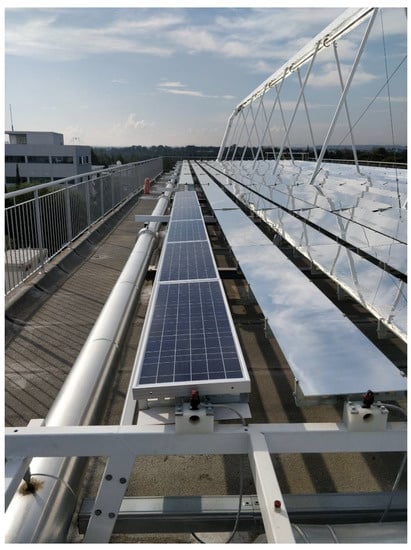 Figure 1 displays the collector in the foreground with the NTL in the background, on the left. In Mediterranean climates such as the one in Cyprus, limiting the use of the LFR concentrator for the sole purpose of air conditioning leads to long periods of standby, such as in spring or autumn, when the ambient temperature is neither hot nor cold. Worse, a collector that is tethered to an office-type building only operates during weekly working days (thus excluding at least 28.5% of the calendar year). In the case of NTL, the non-occupancy periods reach a third of the calendar year. This skyrockets the cost per kWh as the collector although available remains on standby. This point had also been raised in 2013 in the CUT study []: The solar cooling system is at a low power in summer, due to low occupancy, while the available solar resources are at their maximum. The aforementioned PTC in Jordan [] was also designed to co-generate electricity when air conditioning was not envisaged due to low demand. Since the tracker is available for long periods but unused, the present study analyses the relevance of hybridizing the current collector with photovoltaic panels fixed to the back of the primary mirrors, as exemplified for part for a single row in Figure 2.