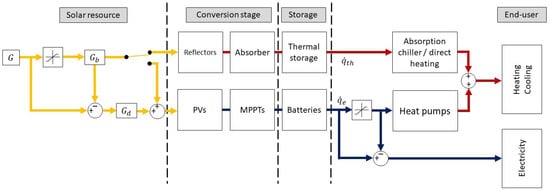 As the system in 1 considers only the collector without its mechanical integration, many components in 2 and 3 do not appear, such as the absorption chiller, water pumps, etc. On the electric side, the elements that connect the collector to the building grid also disappear as well as the power management system. The photovoltaic collector , with or without batteries accordingly to the configuration, operates as a classic net metering system.