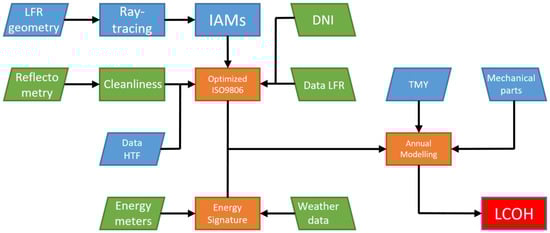 Flowchart for the calculation of Levelized Cost Of Heat (LCOH), including sensors, software, and methodologies.