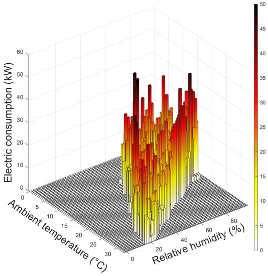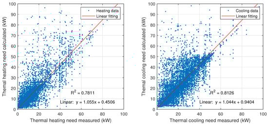 In order to undertake the techno-economic study, this paragraph focuses on the definition of consumer behavior upon collected data for air conditioning. The NTL building has been occupied since the end of 2013. It is composed of 1 basement, 1 ground floor, and 2 additional floors as presented in more detail in []. The shape of the building is rectangular with a north-south orientation, without almost any openings on the southern facade. Heating is supplied with the help of one heat-pump which also supplies cooling in the summer. Two extra chillers supply cooling in summer. These 3 units, referred as “Heat-pumps” in Figure 3, work in association with 6 air handling units and 31 fan coiled units. The electric consumption of some equipment has been registered since 2014 every 15 min with sensors and a data acquisition system, with some rare exceptions, such as the three previously mentioned units. Their electric consumption has been fully registered for years 2014 and 2015, but long disruptions occurred in the following years. The LFR contributes to heating and cooling, lowering the use of these 3 units, thus their consumption of electricity. On the other hand, a weather station records the outdoor ambient temperature and outdoor relative humidity (Davis Vantage Pro 2) every minute. As considered in ASHRAE 55 [], the relative humidity is also a weighing factor for thermal comfort. Thus, electric consumption for air conditioning the NTL has been measured altogether with both meteorological parameters, respectively with 8053 for the heating needs and with 7071 points for the cooling needs representing 3781 h of records. The nameplate electric cooling COP of the heat pump and chillers is 2.78 while the COP for heating is 3.15. The cooling and heating supplied were then estimated by multiplying the COP with their correlated electric consumption. Hence, with the electric consumption on one hand and weather data on the other hand, the energy signature of the NTL building was established as shown in Figure 5. This resulted in the definition of a look-up table with steps of 0.5 °C in temperature and 2% in relative humidity. Such a table was specially generated to be reused within TRNSYS [] to interpolate the thermal needs for a given pair of temperature and humidity. The model generated is compared to the actual measurements in Figure 6. The coefficient of determination averages 0.8.