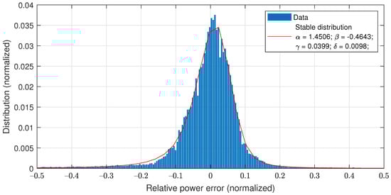 where (W) is the simulated power based on modeling and is the power obtained from measurements. The distribution has been fitted with a stable distribution using MATLAB 2020b®. Its parameters are referenced in Figure 7. A total of 80% of the absolute relative error are within 8.2%, while 95% are within 20.4%.