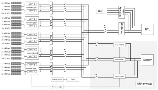 Solar photovoltaic panels have been designed to fit onto the opposite side of the mirrors of the tracking system as in Figure 2 []. This turns the Fresnel collector to an electric generator . The 576 polycrystalline panels of 45 W each (peak power) will cover the same area as the mirrors (184.32 m2). A techno-economic feasibility study was conducted for their integration into the electric network of the NTL building, based on commercially available products. The electric integration is presented in Figure 8. It includes 10 MPPTs (Maximum Power Point Trackers) embedded within 5 inverters that connect bundles of 24 or 32 panels in a series. With a storage capacity, 3 more inverters and a battery unit are required. The whole system is managed by a portal that communicates with each element by internet. The integration includes also the RCCBs, circuits breakers, contactors, isolators, and electric wiring. The strategy for does not consider the option of delivering the electricity back to the electricity grid as for net billing or net metering systems [], but it still complies with the national Cypriot law for its integration in the built environment for self-consumption. Due to the novel approach of such a system, no scheme is yet legally foreseen to sell electricity to the grid. Whenever is not engaged, corresponding to periods of non-occupancy of the building or periods when no heating nor cooling are required, is activated. Due to its specific configuration, the primary reflector can be divided in 4 adjacent bundles in series on the north-south direction. Depending of the height of the sun in the south pane, the northern bundle may reflect the DNI in the virtual extension of the receiver, thus resulting in a loss in end-effect, which is inefficient in regards to the thermal process. As the sun’s height is lower longitudinally, such end-effect losses grow. The can also then be partially activated, at each bundle level, to which corresponds a minimum angle where the radiation is totally lost for the end-effect. Whenever this occurs, it produces electricity by partial flipping to PV tracking. The remaining bundles further produce heat.