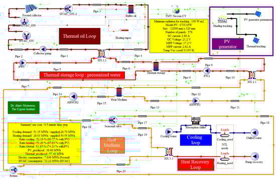 The mechanical integration has been presented in 2017 by []. The layout in Figure 9 has been optimized for the purpose of the paper by hiding the control components, equations, and output components to promote visibility. The whole piping is included in the modeling that links components to each other such as pumps, valves, tanks, etc. representing 20 units of pipes. The piping is characterized by its metric dimensions and the heat losses coefficient based on the material and average thickness of the surrounding insulation. The piping is exposed to the outdoor temperature component to include thus thermal losses to the environment (green links). The same applies to the 3 tanks installed outside, so their respective heat losses are computed according to their thermal insulation properties. The pumps are all modeled following their respective datasheet, in terms of flow and electric consumption. The consumption of the 19 CPUs controlling the LFR are also included in the modeling.