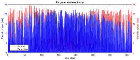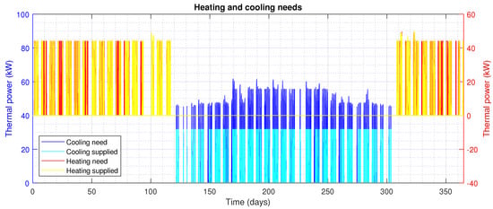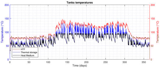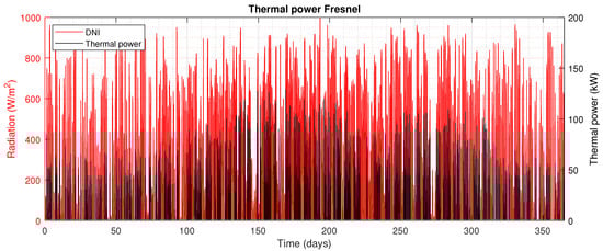 The heat of the oil loop is then transferred to the thermal storage loop of pressurized water (in red). A tank of approximately 2000 L stores water up to 146 °C, nominally providing 2 h of storage for heating operation in winter and 4 h in winter for heating. The Nitrogen is also used to pressurize the water with the help of an expansion tank. This loop also encloses two pumps: One for the heat transfer with the oil and another pump is used to transfer the heat to the loop, firing the absorption chiller (in orange). This loops also contains an 800 L tank to buffer the water’s heat for the stable operation of the absorption chiller in summer. The single effect absorption chiller used is very sensitive to the inlet temperature of heat medium between 70 °C and 95 °C, but the lower the temperature the lower its efficiency. The tank is equipped with heating tapes too, but in practice these are not used. In summer, the heat is sent to the absorption chiller loop (in blue). The single effect absorption chiller with 35 kW of cooling capacity is modeled altogether with the associated evaporative cooling tower and the pump of chilled water coming from the building. The electric heat-pumps and chillers have been designed to operate so that the chilled water fed to the building is at 7 °C and exists at 12 °C. The same settings apply to the absorption chiller. The chilled water is distributed into the NTL, while cooling is transferred in the offices via fan coiled units and with air handling units in larger spaces. If a temperature of 7 °C can not be reached, the heat-pump and chillers compensate. In winter, the heat is sent directly to the heating water of the building via a heat-exchanger (heat recovery loop in red at the bottom in Figure 9). The heating system supplies heat via hot water to the building at 55 °C and returns at 45 °C. If the solar-assisted system cannot reach 55 °C, the heat-pump backs up. is activated whenever the thermal storage is low in temperature, i.e., 70 °C in winter and 100 °C in summer, to a trigger and rapid response to heating and cooling needs. The absorption chiller in summer operates with a nominal feed of 88 °C, while the temperature required for heating in winter is 55 °C. The absorption has been modeled as per its performance characteristics towards dynamic conditions (chilled water, cooling water, hot water properties, and ambient temperature) as communicated on its datasheet. The is activated whenever the DNI is higher than 100 W·m−2. If these conditions are not fulfilled, the collector shifts to an electric supplier, as shown in purple square on top of Figure 9. The modeling includes the shading between PVs and the temperature dependence of their efficiency. Modules have been distributed in 8 groups to allow partial defocusing due to the end-effect. The modeling includes the shading between PVs and the temperature dependence of their efficiency. Modules have been distributed in 8 groups to allow partial defocusing due to the end-effect. The modeling was conducted based on a one-year period sampled at 30 s time intervals and with TMY data of Nicosia, Cyprus. Figure 10 represents the thermal power output from the LFR. The density of production is higher in summer as expected while power is 0 kW during weekends and closure days. Figure 11 represents the temperatures of the oil’s buffer, the tank of pressurized water (thermal storage), and the heat medium storage feeding the absorption chiller. All 3 tanks have a lower average temperature in winter as the heating needs are at a temperature level of only 55 °C. In summer, the minimum temperature for the absorption chiller is 88 °C, so the temperature of the 3 tanks increases. Figure 12 represents the thermal needs and supplies for the NTL throughout the year. Figure 13 represents the electricity produced by the in blue. In red is the electricity produced by a PV generator with the same surface on the roof, but fixed. As shown, the power of the latter is often higher and this will be discussed in Section 3.2.