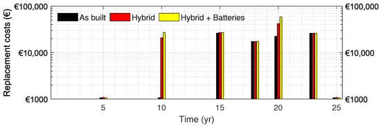 The figures correspond to the actual configuration, with the projected replacements costs. Figure 15 illustrates the replacement costs for 2 and 3 for the three configurations. Hybridization increases the replacement costs and batteries even more as expected.