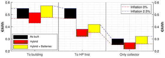 As a reference, the levelized cost of energy (heating and cooling supplied to the building) varies between c€46.8–55.0. This is the same for 2. The LCOH with PV varies between c€32.0–38.0, meaning that the photovoltaic generator further reduces the cost than in 2. A decrease of lower magnitude is achieved for the LCOH with the integration of batteries: c€35.2–41.9. In both 2 and 3, the hybrid system without batteries is the cheapest solution and cheaper than the in each case. However the batteries increase the final LCOH, which is higher than the when the electricity is indifferently used by the building.