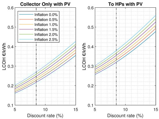Effect of the discount rate on the final LCOH of the hybrid collector only with PV (left) and of the integrated hybrid collector feeding first the heat-pump and chillers (right). The vertical dotted line corresponds to 8.5%.
