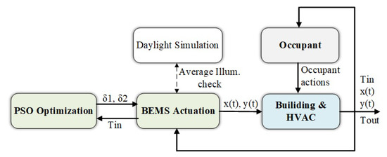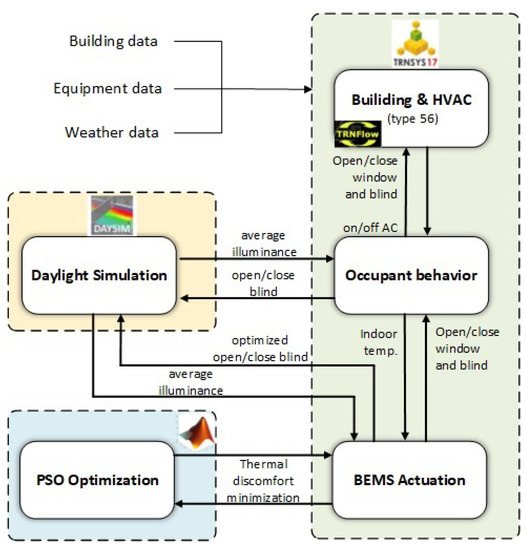 Moreover, with TRNSYS is possible to simulate the occupant behavior i.e., manually closing/opening the windows and the blinds and activating the AC system. Notably, the outdoor and indoor air temperatures affect the occupant behavior in buildings: the individuals turn the HVAC on/off, open/close windows and open/close blinds depending on the outdoor and indoor temperatures. In addition, the BEMS module is activated according to indoor temperature and interacts with an optimization module that minimizes the LPD index. It is remarked that, in this paper, the BEMS action is auxiliary and the humans act independently based on the personal comfort sensation.