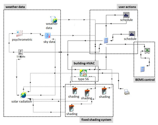 In particular, as it is shown in Figure 1, the building-HVAC system includes all the building and HVAC features. It is realized by TRNSYS v.17, which is a tool for simulating the energy flows in buildings, taking into account the weather and indoor conditions, the indoor loads and the HVAC systems.