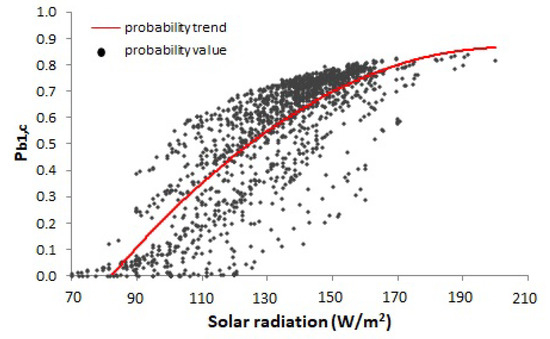 Therefore, the probability for blinds opening and closing are defined and treated separately on the basis of the cited variables. Hence, the probabilities of blind opening () or closing (), at time t, on the basis of the solar radiation are obtained by the following logistic regression formula: