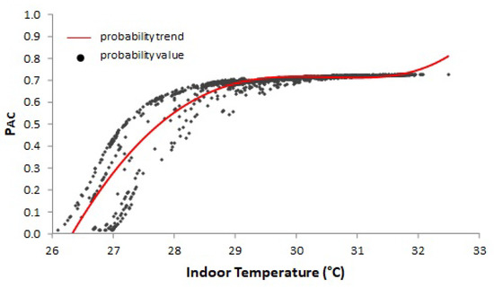The AC system is activated by occupants when feeling hot. The stochastic function proposed in [37,45,46] is used to describe the probability of activating AC as a function of indoor air temperature.