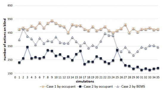 At Step 2 the set of probabilities are computed and a real number is generated at random, with uniform probability, at each time step. In order to determine if the occupant actions on windows, blinds and AC take place or not in the next 15 min, the value of is compared to Equation (5), (6) and (8), respectively. Afterwards, at STEP 3 the highest probability of is selected. In STEPs 4, 5, 6, 7, 8, 9 and 10 Algorithm 1 identifies the highest probability and verifies that it is greater than the random generated number . If it is true, the action associated with the identified probability is performed by the occupant, else no action is taken. Moreover, if the highest probability is , then at Step 10 is compared with : if then the AC is turned on else it is turned off. We point out that each action is performed if it is possible: for instance the window can be opened if it is closed at the beginning of the considered time window. It should be assumed that the aforementioned probabilities of actions by occupants are only possible when there is occupancy in the rooms. If no occupancy is detected, the BEMS optimizes the operation of windows and blinds by maximizing the potential of passive cooling for natural ventilation and solar radiation.