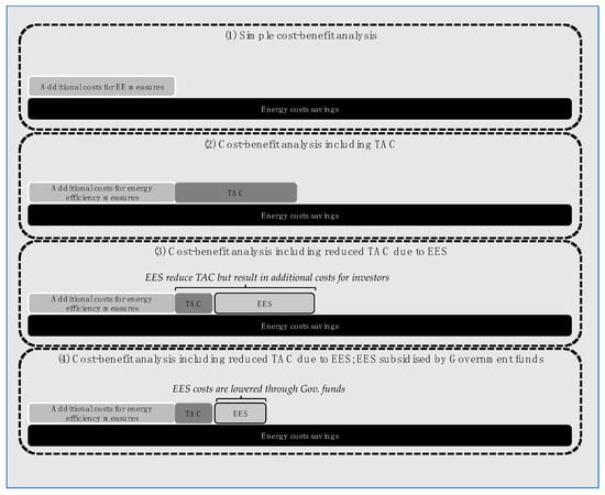 The following Figure 1 presents a schematic overview of how TAC and EES are related to each other and how an EES can be a TAC-reducing element. Importantly, the bars are only for illustrative purposes. The bars in the first section (1) of Figure 1 show a simple cost–benefit analysis regularly conducted by practitioners or scholars. It calculates the additional costs of the energy efficiency measure (upper bar) in relation to the energy costs saved (lower bar), suggesting that savings outweigh costs. The second section (2) extends this method by integrating TAC, illustrating that costs for a transaction increase the overall costs by an unspecific amount (upper bar). In the next section (3), EES are added to the cost–benefit analysis, which also increases the overall costs (upper bar). However, the potential of EES to drive down TAC is depicted by the smaller TAC block (dark grey) in contrast to (2). Section (4) illustrates that government funding lowers the investor’s costs for EES.