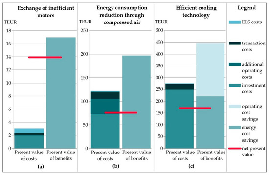 For all measures considered, the benefits (present value) are significantly higher than the costs (present value) of implementing the measure. Thus, the capital value (net present value) is also positive. The benefit–cost ratio is therefore >1 for M1 to M3, and the investment is cost-effective for all energy efficiency measures. This applies even if the classic cost–benefit analysis is extended to include additional cost categories such as transaction costs for implementing the measure and costs for the corresponding EES. It is noticeable that, for M2 (compressed air) and M3 (cooling), the cost–benefit ratio is positive but somewhat lower than for measures M1 (motors). M1, in turn, shows that consulting costs are higher than transaction costs, rendering the former questionable. For high-investment measures (M2, compressed air; M3, cooling) the consultancy costs are low or negligible compared to the investment costs and compared to TAC. Nevertheless, even for low-investment measures, it can be assumed that EES will contribute to implementation by reducing transaction costs even if they are relatively cost-intensive in relation to investment costs.