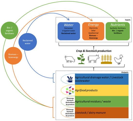 Figure 1 summarizes the inputs and outputs of agricultural (crop and livestock) systems to be taken into account in this review. Emphasis is placed on reused water, bioenergy, and organic fertilizers/biofertilizers that constitute sustainable inputs to the system. These, at a first stage, should be produced by using the outputs of agricultural systems, such as crop (or livestock) residues and wastewater, and, secondly, be applied in crop and livestock production systems pointing out the circularity of these closed-loop systems. Urban or industrial wastewater was excluded from this system.