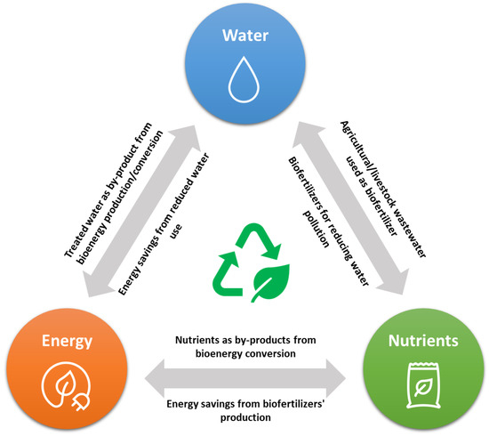 As abovementioned, the main pillars in designing a CE-based agricultural system are water, energy and nutrients. It is profound that there are various correlations and links between these pillars, creating technological bases for sustainable economic and social development (Figure 2). For example, in most cases when water treatment is under study, apart from the water that is supposed to be used for irrigation purposes, there will be a by-product that may be exploited as fertilizer after specific treatment.