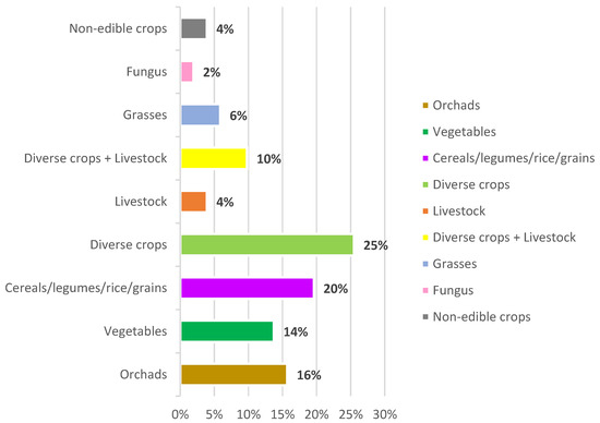 Based on the literature reviewed in the current work, the resources were reused in a wide variety of crops (Figure 5). In most studies, the resources were applied in diverse crops (13 studies), 10 in cereals, 8 in orchard crops, 7 in vegetable crops and the rest in other types, including livestock production systems. This allocation intimates that the reuse of resources is applicable in almost any kind of crop, given the specific features of each closed-loop system.