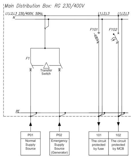 Additionally, in expanded building systems, there should be guaranteed protection devices working selectively [3]. This situation is different for installations supplied from the local low-power sources, especially in typical low-voltage installations supplied both from the power network and a local backup power source (called hybrid installations—Figure 1). In hybrid installations, while there is no voltage from the basic source (grid), the emergency power source is switched on (synchronous generator). This solution provides energy-independence, but also causes a need for detailed analysis of the short-circuit cases for backup mode. Problems can occur with achieving the same short-circuit conditions for the same protection device installed in given circuits, both for the supply from the grid and local backup generator. The described problem is shown in Figure 1.