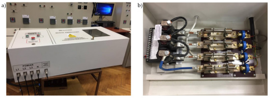 Short-circuit current analysis was carried out in a system powered by a synchronous generator with rated power equal 16 kVA (the rated data of the generator are presented in Table 1 and Table 2—marked column), driven by a DC motor MS1322 M32 (made by Leroy-Somer, Angouleme CEDEX, France)—shown in Figure 3a,b. The created laboratory power system model powered a static receiver of the RL type (adjustable resistance load from 0 kW to 9 kW, with the step of 0.6 kW, and inductance reactance from 0 kVAr to 9 kVAr) through a sectioned model of II type lines (parameters of each section were the same and equal to , ). Additionally, a specially prepared short-circuit module and measurement system with data acquisition were included in the model.