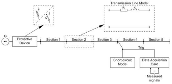 The electrical hybrid power system made in the laboratory scale tested MCB types B and C with rated currents: 16 A, 20 A, 25 A, and also the full range fuses gG type CH10 × 38 with rated currents 10 A, 16 A, 20 A, 25 A. All types of mentioned protections were tested for different current values. Due to the possibility of short-circuit occurrence place change in the five section line model (second type), there was the possibility of getting different short-circuit impedance loop values, and, thereby, modeling different short-circuit conditions. The tested apparatuses were installed on the output nodes of the synchronous generator (Figure 4).