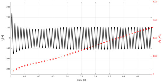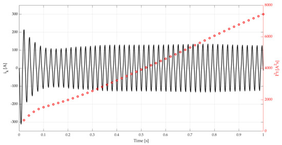 Additionally, by means of the red markers, there are visualized changes of the revealed heat energy during short-circuit (Joule’s integral calculated after each period) on the metal strip of the fuse during current flow [28].