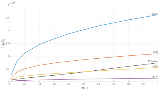 According to data contained in Table 4, obtained during a laboratory test, in Figure 7, it is visible is that the gG25A fuse will never switch-off the short-circuit. The gG20A fuse would probably be burned out in time (much longer than 1 s). The gG16A and gG10A fuses switched-off the short-circuit in 10 ms, what is confirmed on the chart (for gG16A, there are two cross points: first in 10 ms, second in 520 ms). The whole curve gG10A is below the line of the real measured energy (black dot line), so that the fuse worked immediately. The Joule’s integrals in Figure 7 were obtained based on the catalogue data [30]. The calculated curves of Joule’s integrals regard the changes of short-circuit current flowing times. Based on the presented characteristics (Figure 7), there is the possibility to verify the burning out times for different fuses. Additionally, the derivative of fuse characteristic allows to evaluate the chance of circuit breaking, in case of higher fuse rated currents for longer short-circuit times (for example based on the mentioned method, the gG20A fuse can be burned out, approximately, after 2.2 s).