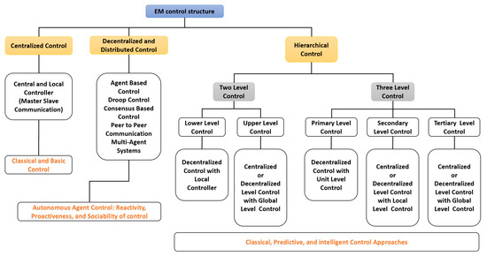 Numerous research works have been carried out for MG control according to system’s topologies, structures, and operation modes [33,61,62]. For example, optimization and control methods should manage the stochastic nature of the installed RES generators by ensuring a reliable supply of power to consumers while keeping the storage system, electricity bill, and occupants’ comfort at the acceptable operation conditions. Figure 7 presents a proposed classification of the MG control methods commonly used in MG operations. A brief description of each method is presented in the rest of this section. Furthermore, various steps should be specified, as depicted in Figure 8, for EM in MG.