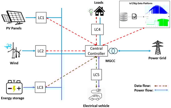 Centralized control approaches use a single central controller (CC), which is characterized by a high-performance computing unit and a secure communication infrastructure in order to manage different entities of the system (e.g., RESs, storage systems, TEG). Each entity uses a local controller (LC) in order to communicate and directly interact with the CC. Moreover, using recent communication and computing technologies (e.g., IoT, Big-Data), the CC is able to monitor, collect, and analyze real-time data. This allows all entities to collaborate with the central EM controller while ensuring a flexible MG operation in both grid-connected and standalone mode (Figure 2). The CC collects data, such as RES energy production, energy consumption pattern, the energy price from market operators, and weather conditions, and then executes the optimal and efficient system’s control.